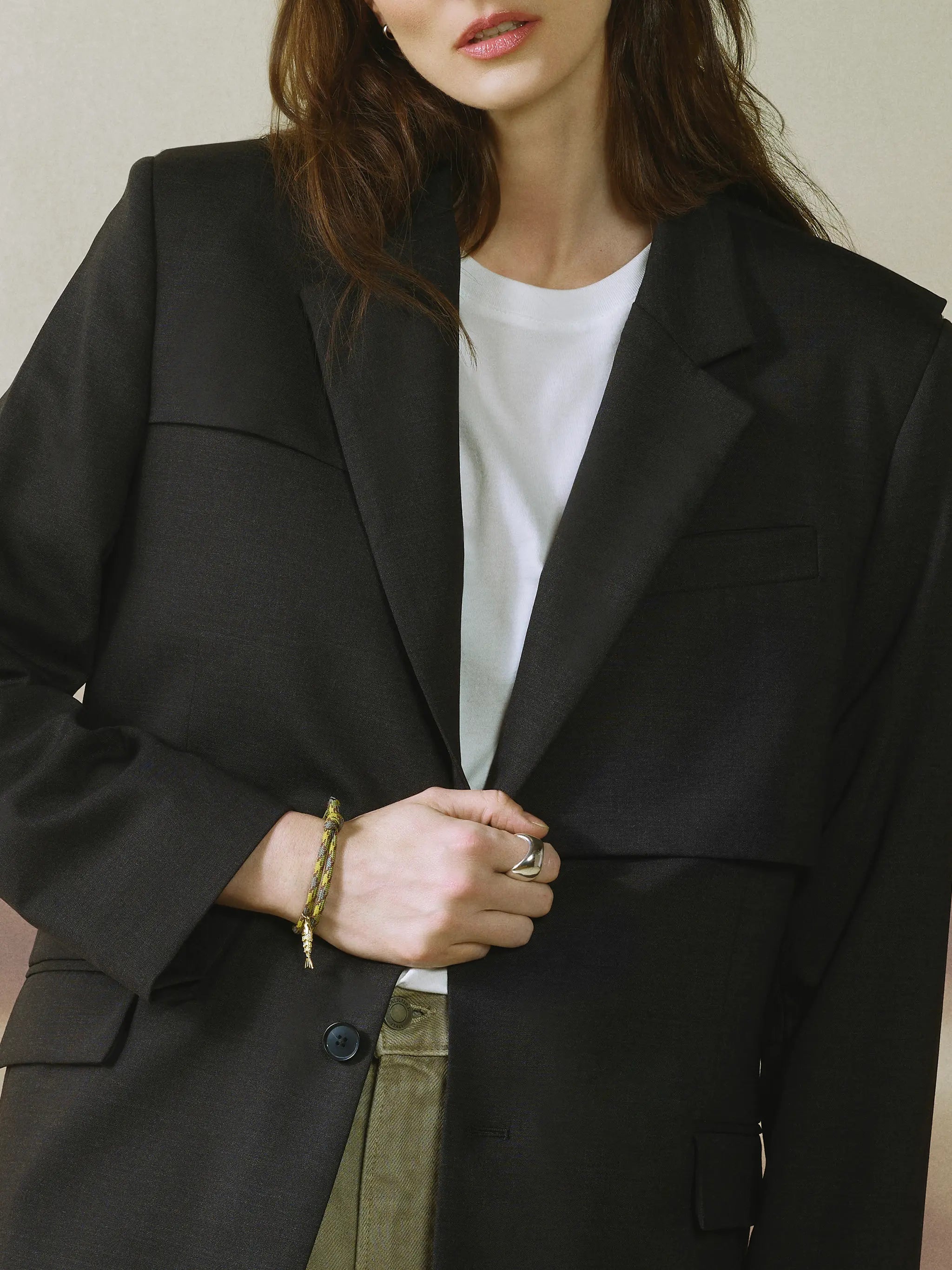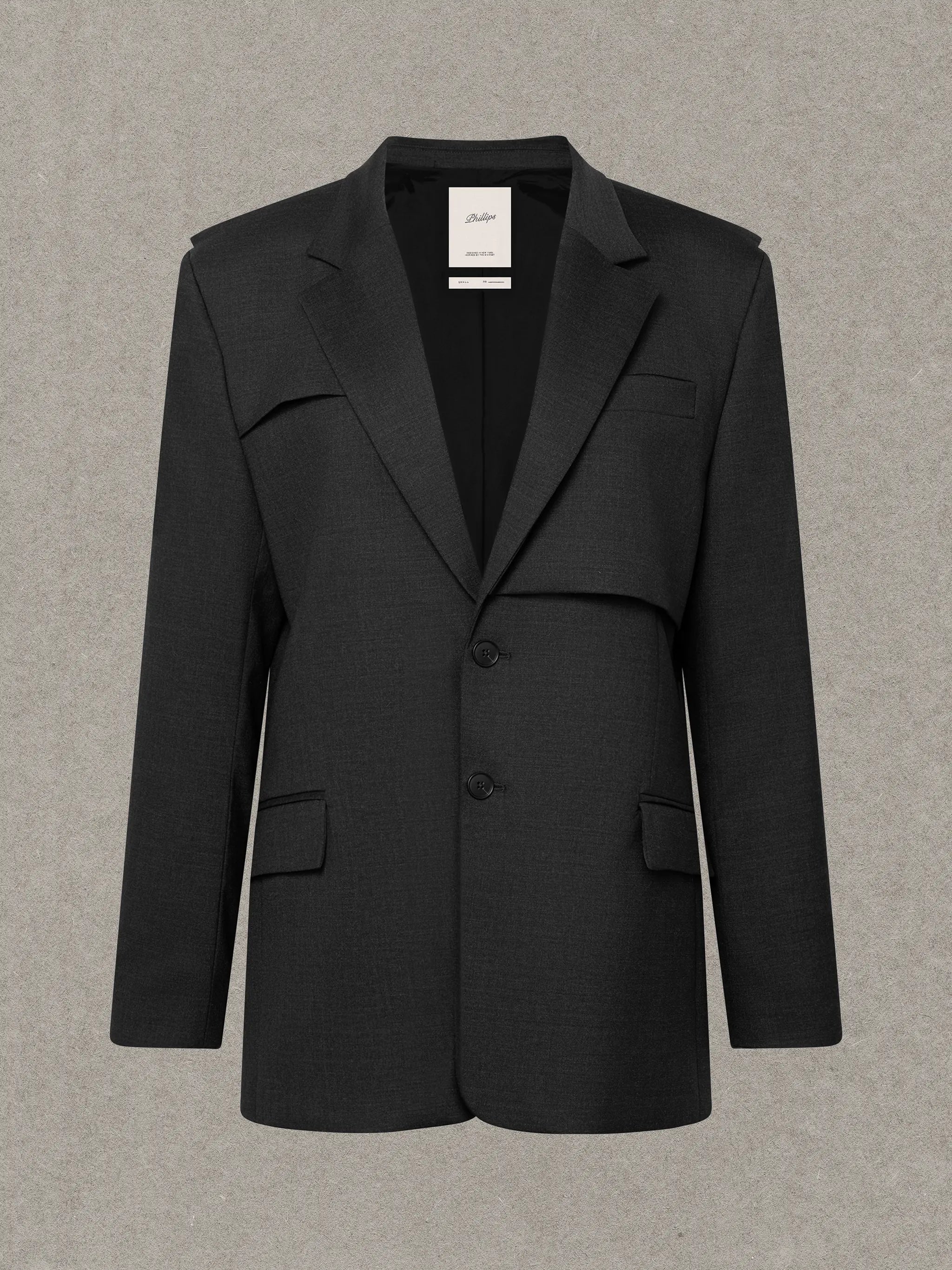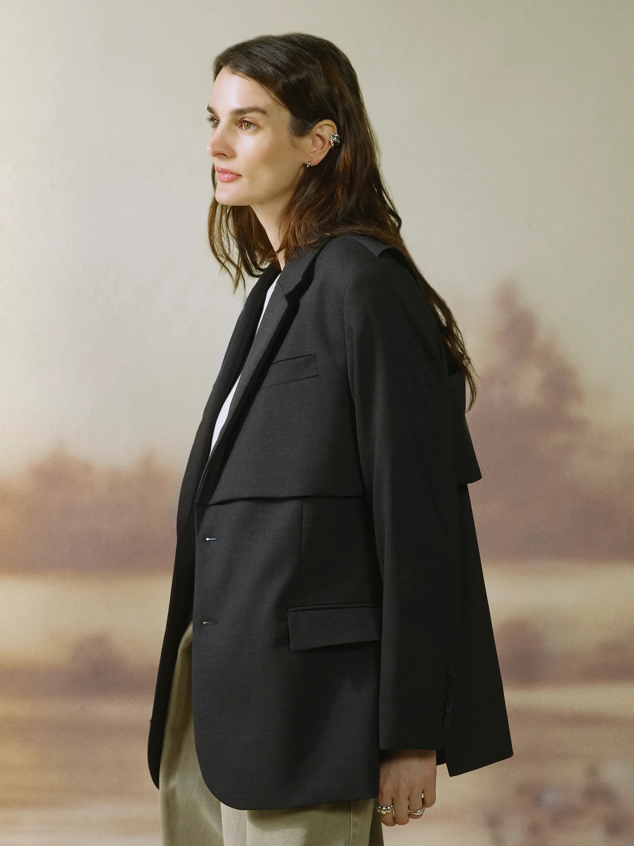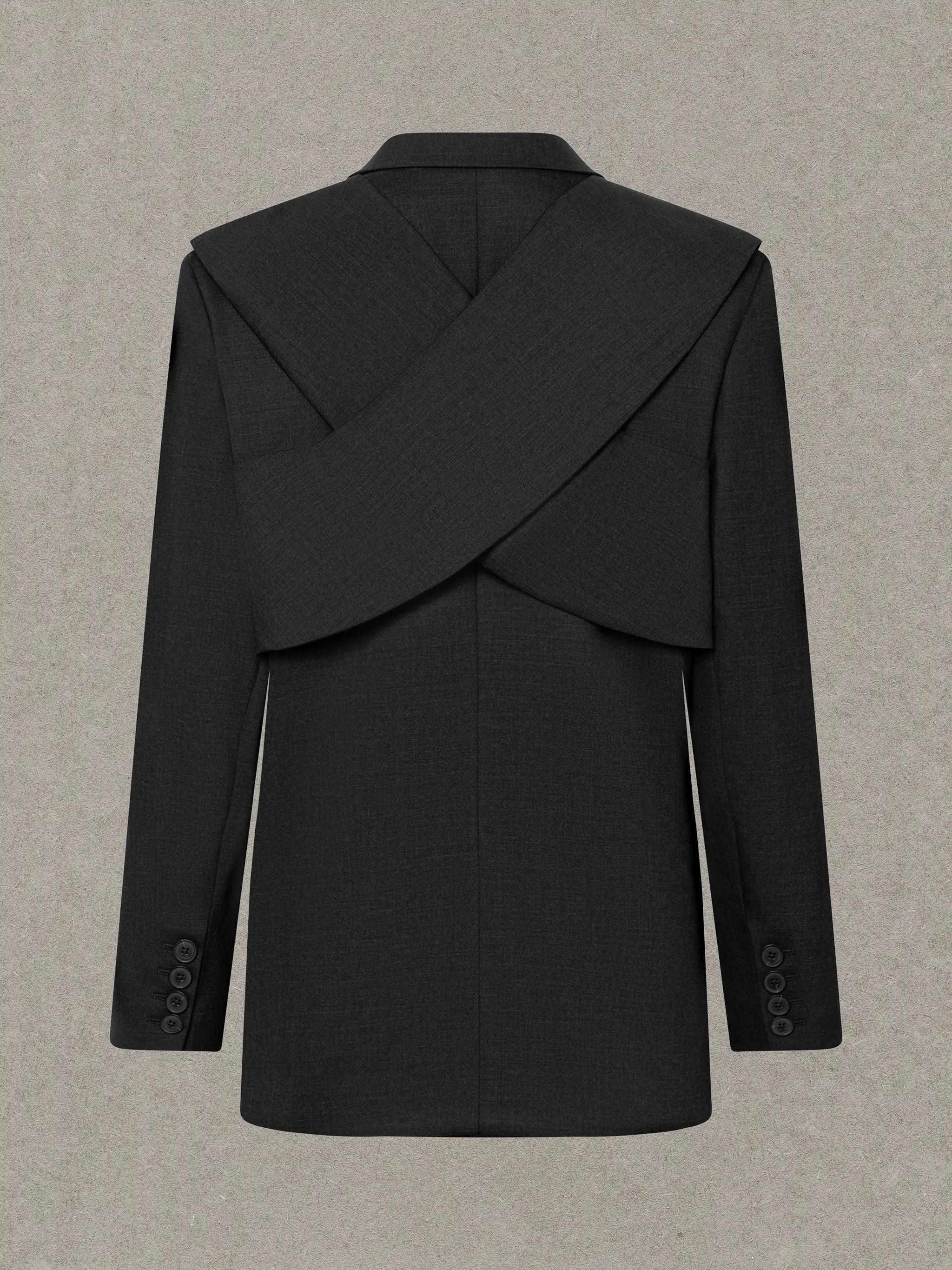 - Oversized silhouette with a relaxed, tailored drape