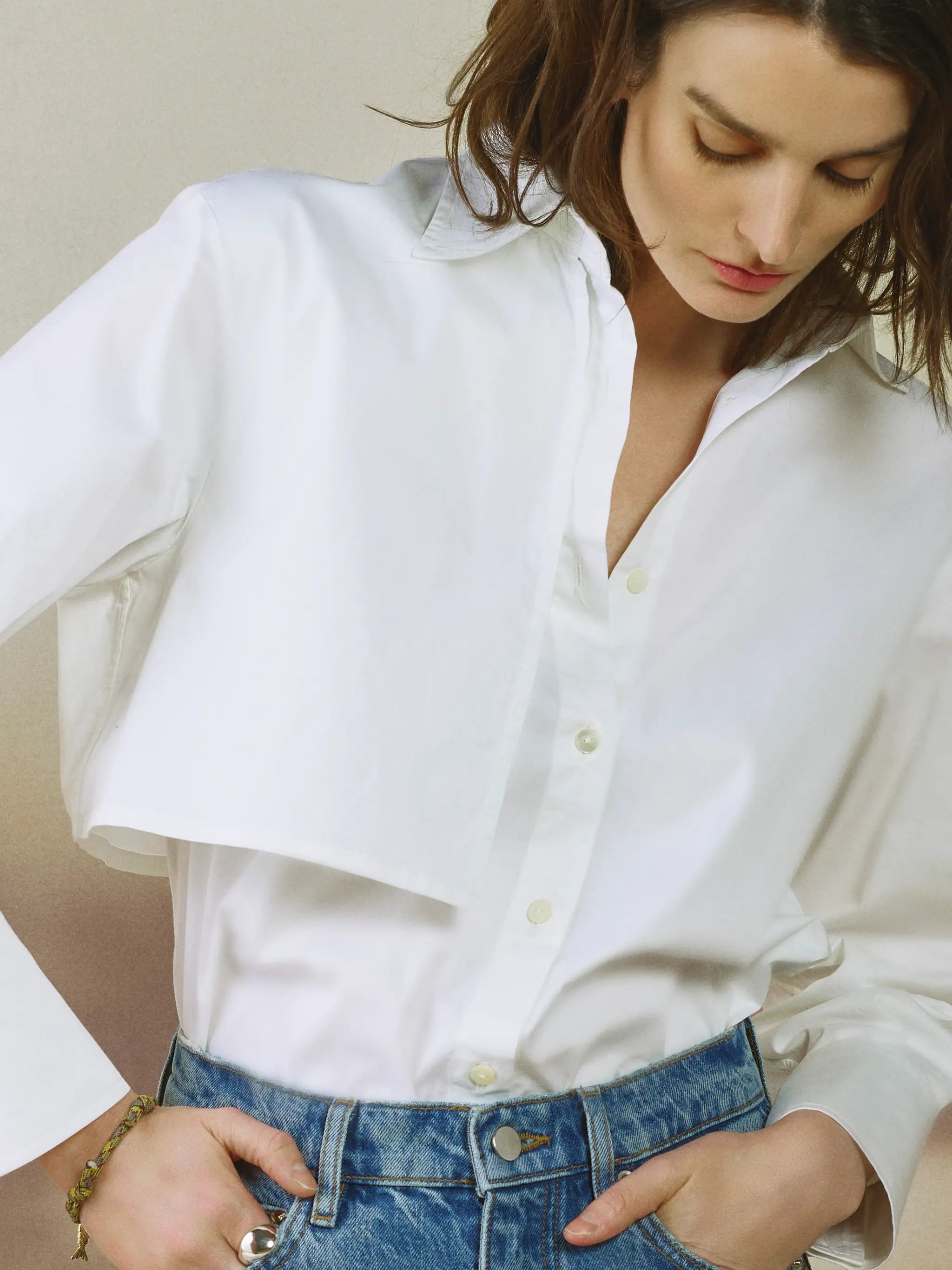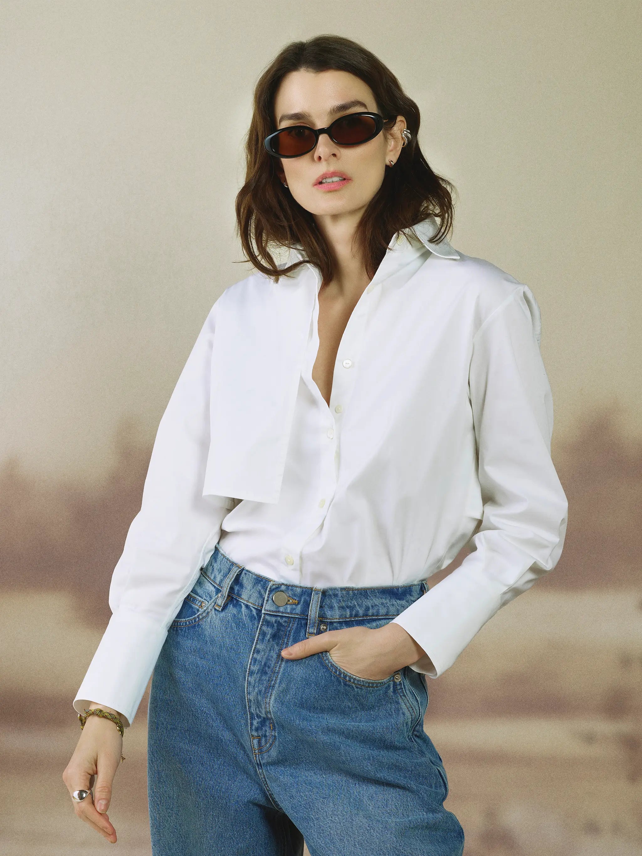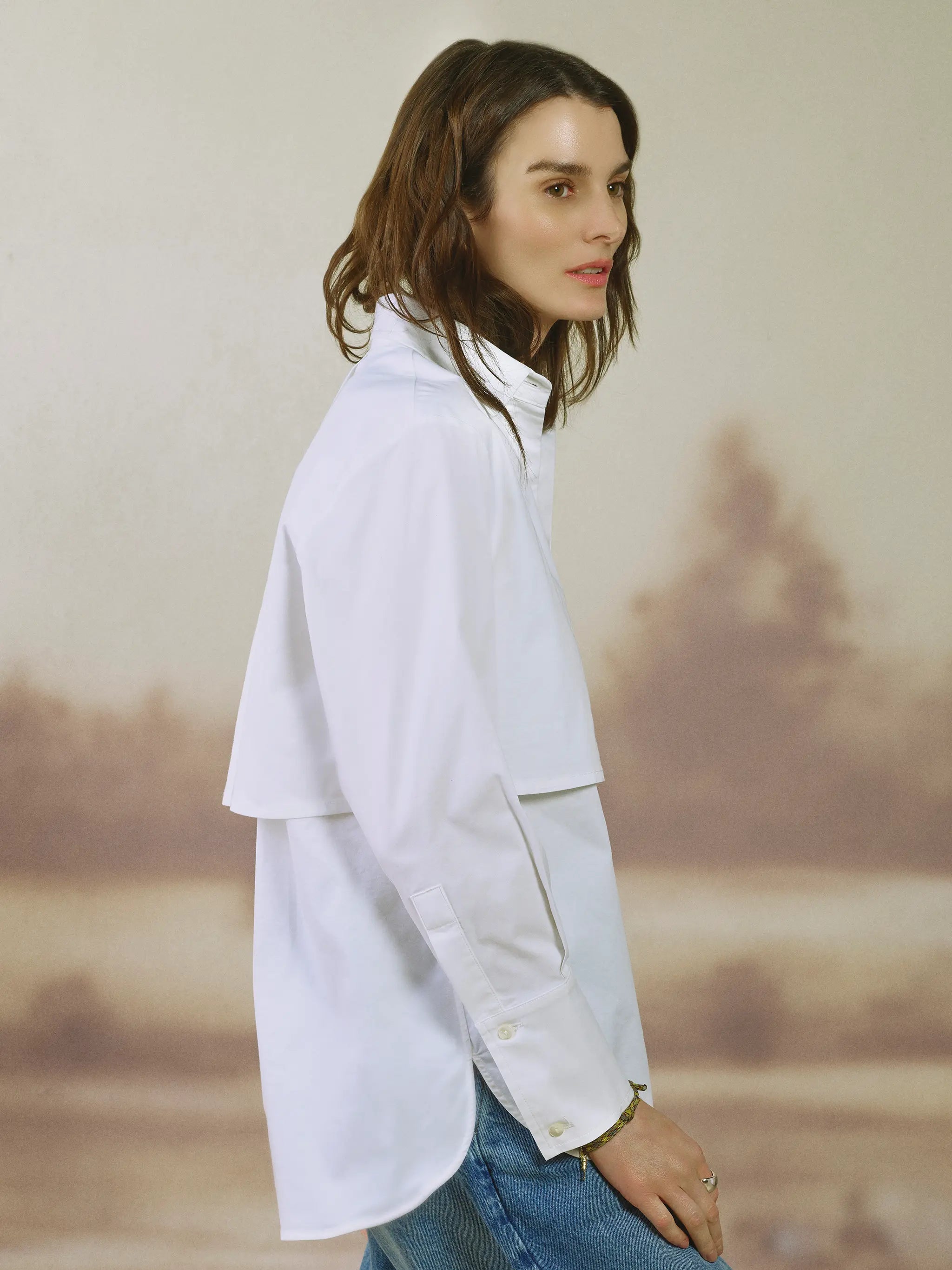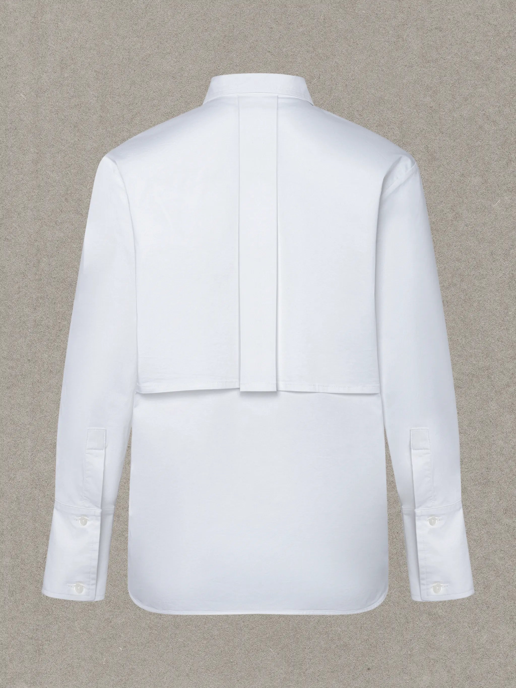 The Phillips Shirt in Milk is cut from crisp cotton with a touch of stretch, offering structure that softens with wear. Clean and classic in tone, it’s designed to work as both a foundation and a focal point. Worn loose, the silhouette feels oversized and effortless; tucked in, the back wind shield and front gun flap create shape through the waist, bringing structure to the body. A concealed placket detail allows for adjustable coverage at the bra line, reducing gaping while maintaining a clean front. Finished with tall cuffs that can be styled buttoned, unbuttoned, or rolled, it’s a versatile piece meant to be layered under tailoring or worn on its own as a considered, everyday statement.