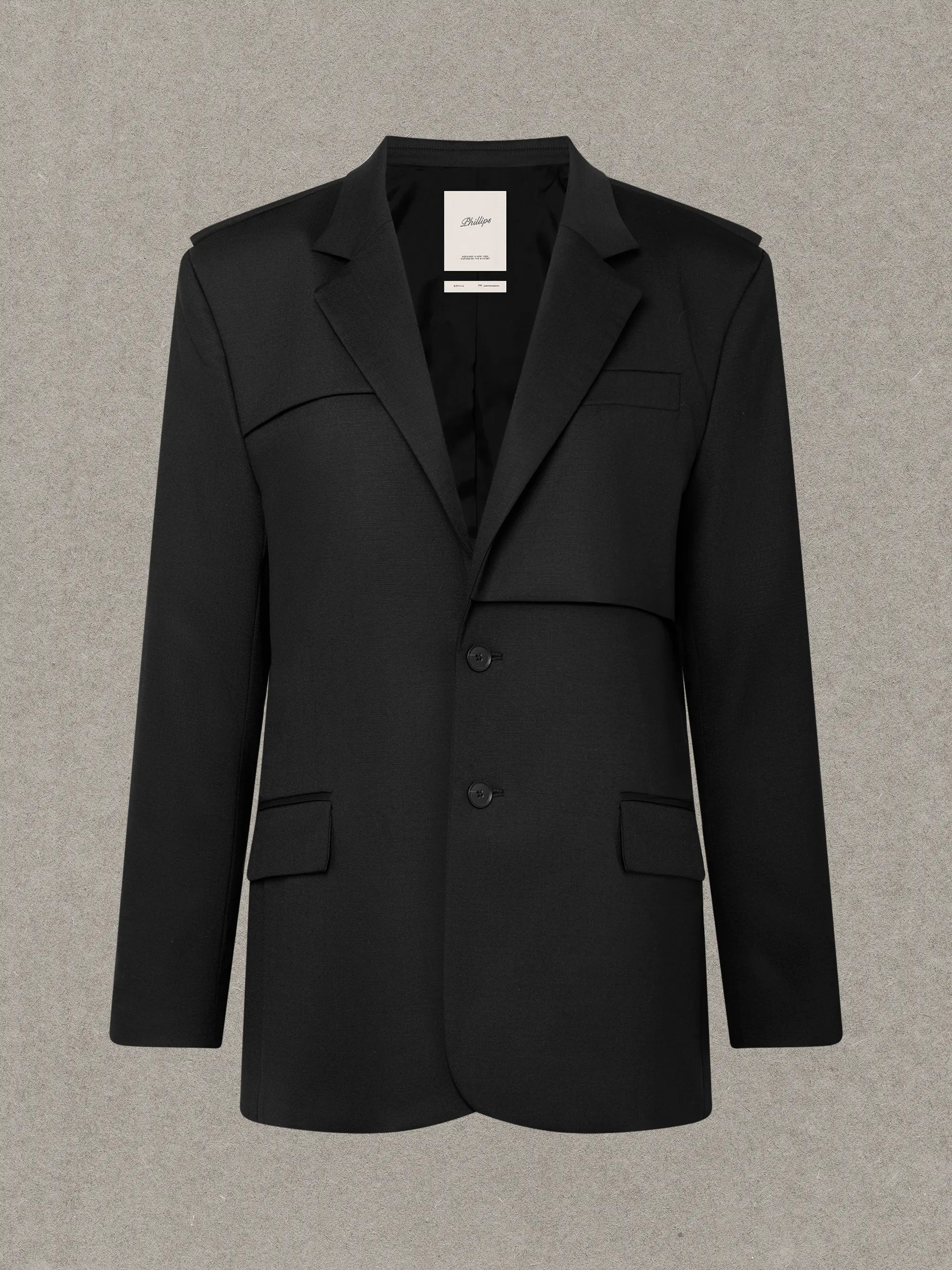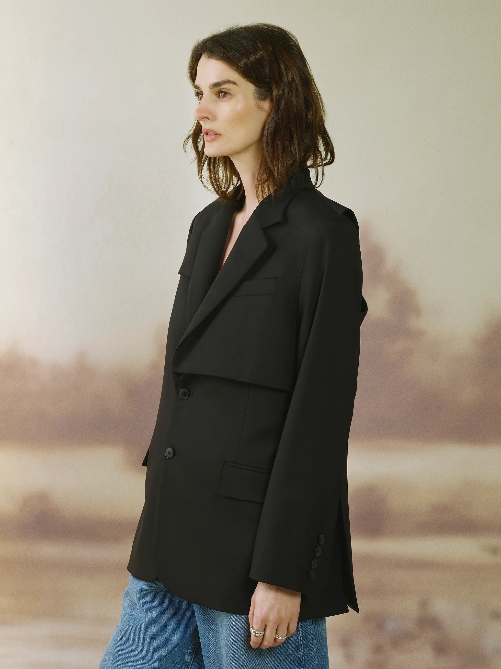- Oversized silhouette with a relaxed, tailored drape