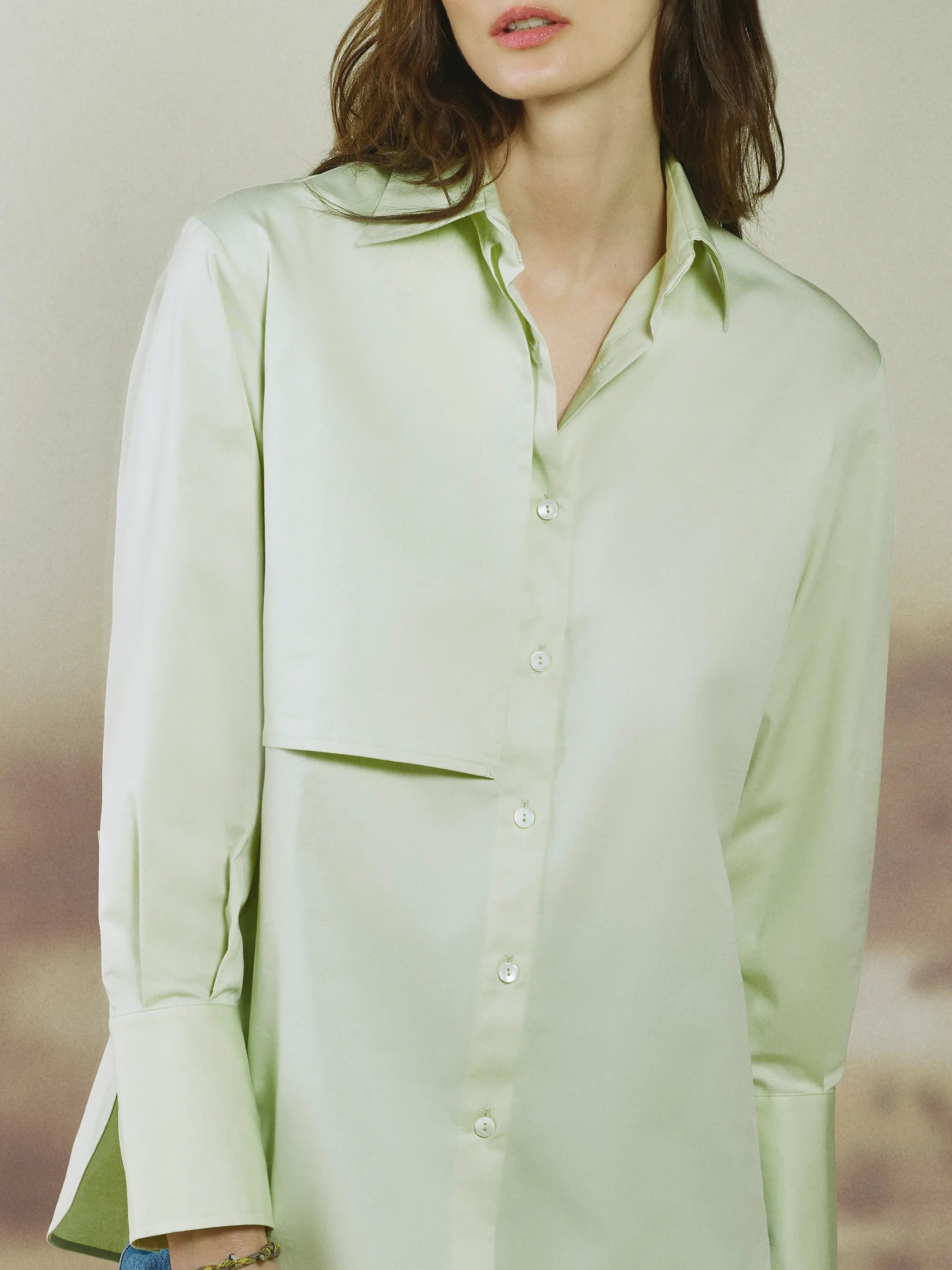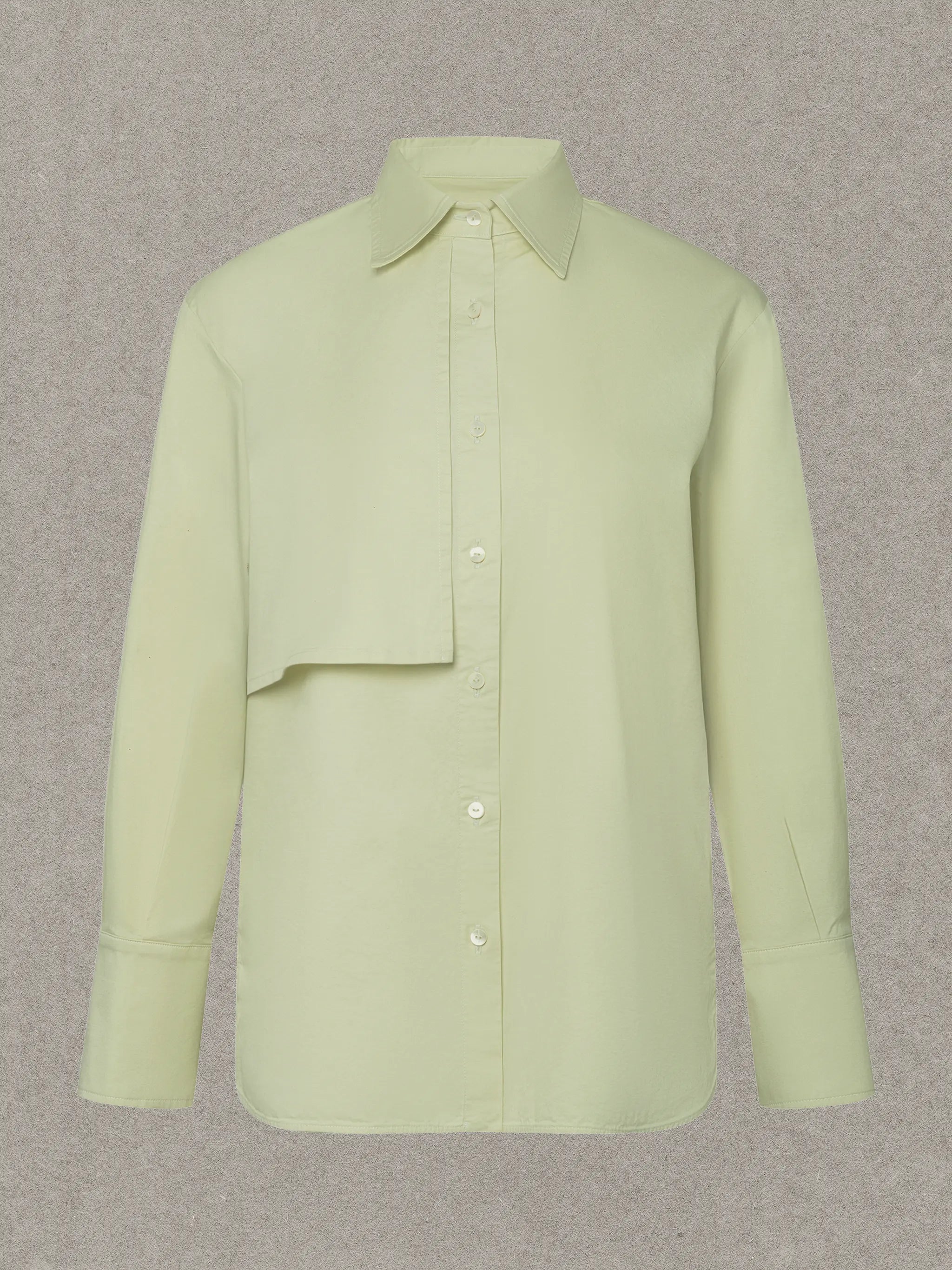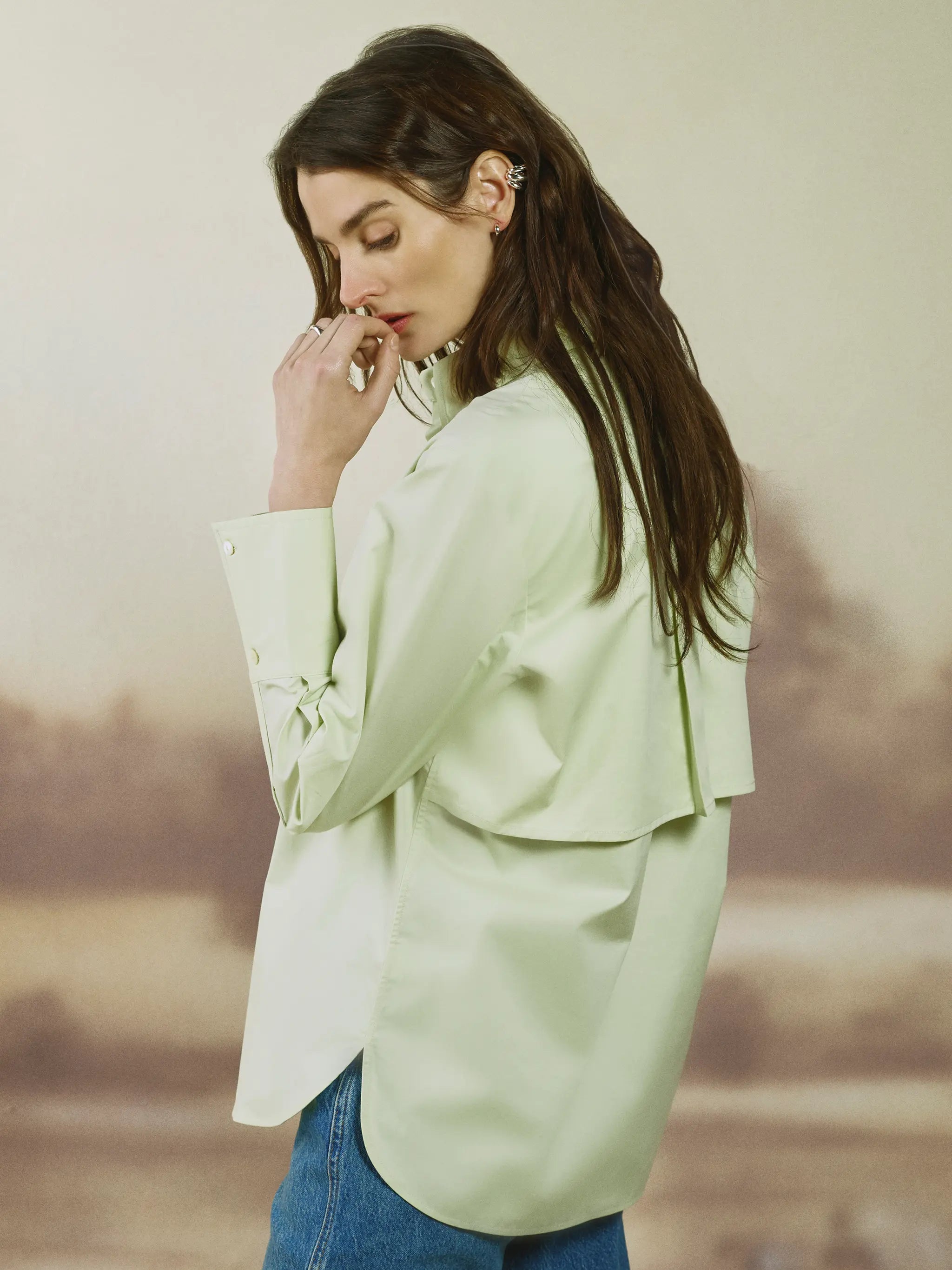 The Phillips Shirt in Duckweed is grounded in the muted greens of lakeside edges and late-season landscapes. Cut from crisp cotton with a hint of stretch, it offers comfort without losing its shape, becoming softer and more familiar over time. Designed for versatility, it can be worn layered under jackets or styled on its own as a statement. When worn loose, the silhouette feels relaxed and oversized; tucked in, the back wind shield and front gun flap work together to create shape and structure. Concealed buttons at the placket allow for adjustable coverage at the bra line, while tall cuffs add a refined, adaptable finish. A considered piece shaped by landscape, wearability, and modern utility.