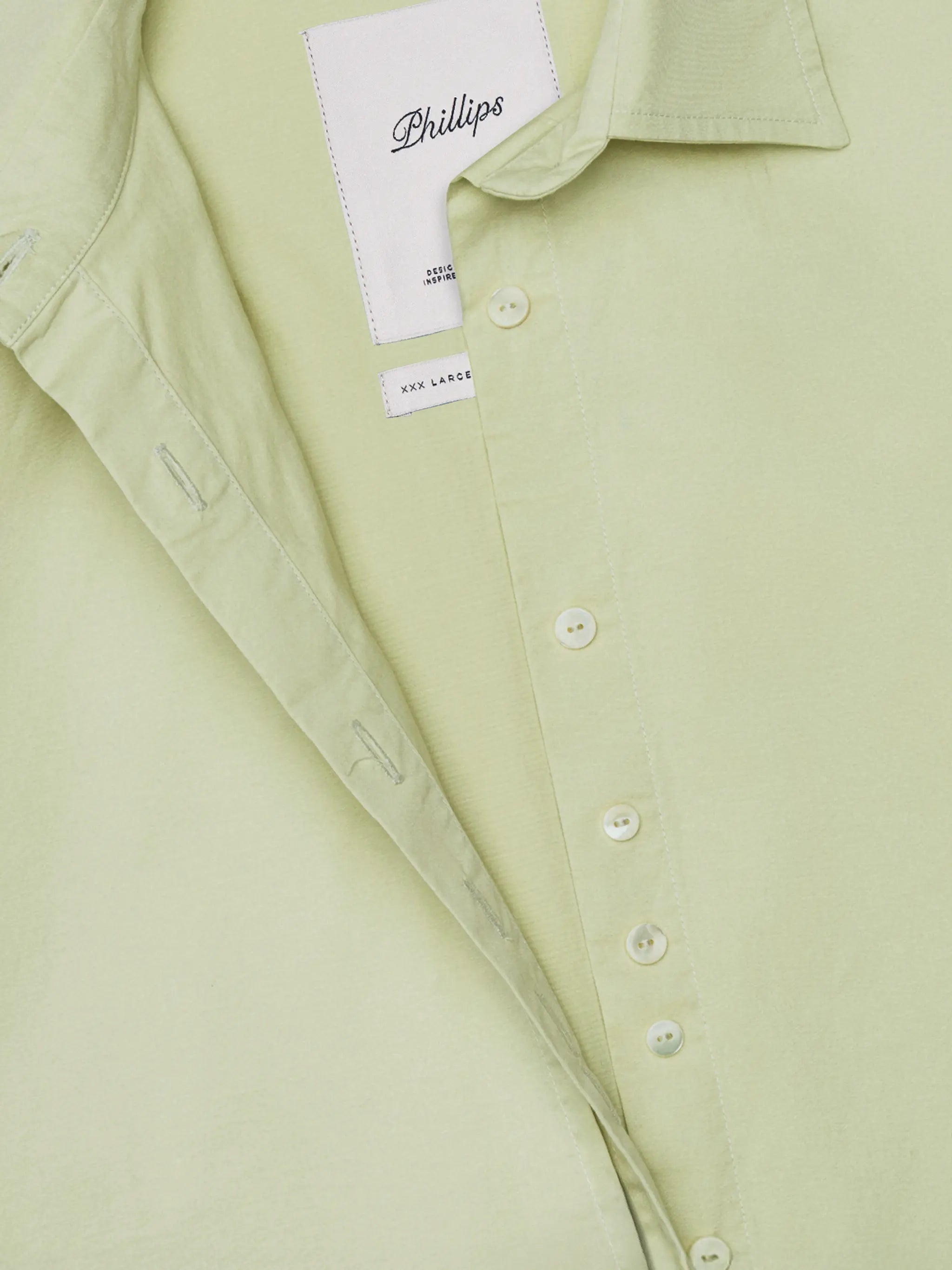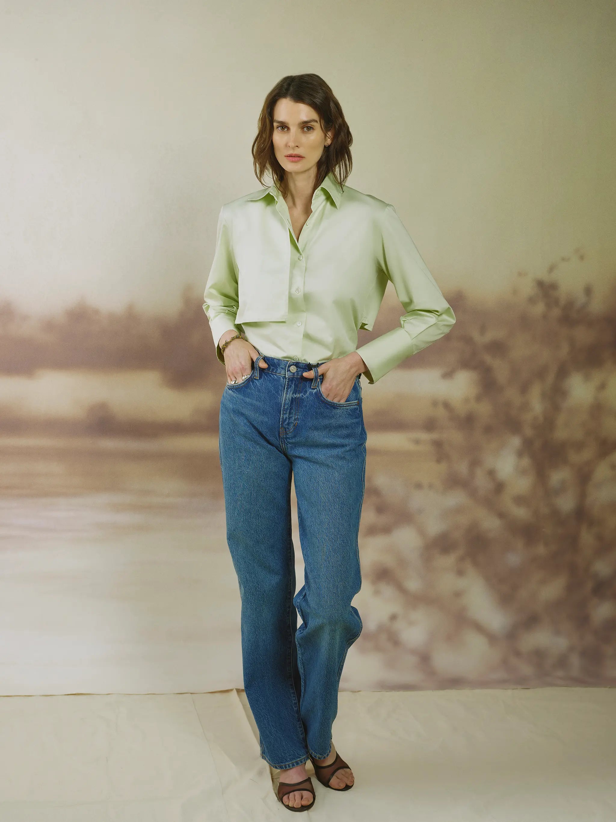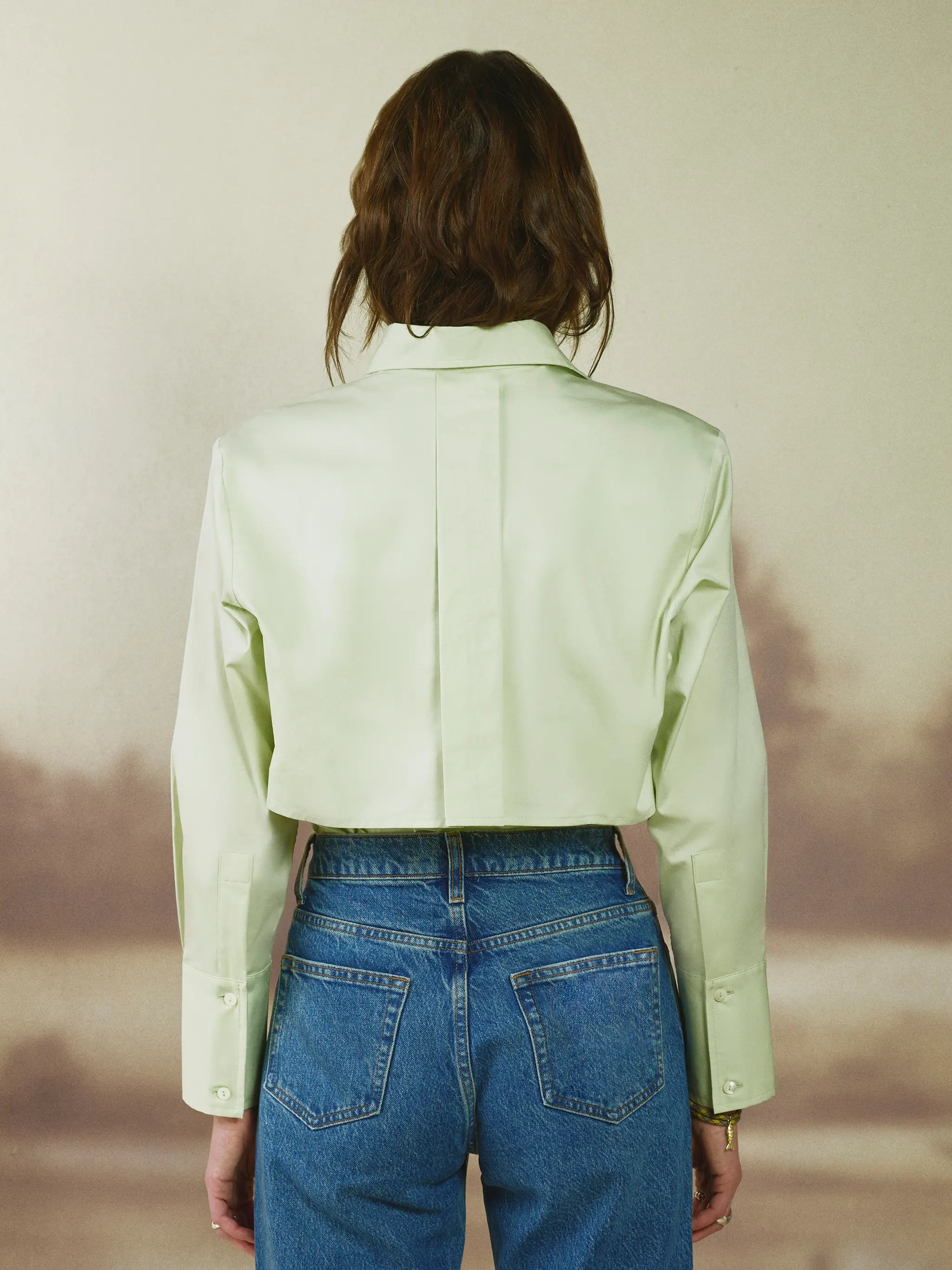 The Phillips Shirt in Duckweed is grounded in the muted greens of lakeside edges and late-season landscapes. Cut from crisp cotton with a hint of stretch, it offers comfort without losing its shape, becoming softer and more familiar over time. Designed for versatility, it can be worn layered under jackets or styled on its own as a statement. When worn loose, the silhouette feels relaxed and oversized; tucked in, the back wind shield and front gun flap work together to create shape and structure. Concealed buttons at the placket allow for adjustable coverage at the bra line, while tall cuffs add a refined, adaptable finish. A considered piece shaped by landscape, wearability, and modern utility.